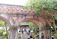 旧蹴上発電所に到着です- ![]() - - -![]() ガイドによるとこの建物は。。。 1912年、第2次疎水工事と共に、 京都市によって施工完成された、第2次蹴上発電所の跡です。 発電機5台、5,000Wの出力でした。1936年まで運転されていました。 その後は、京都大学の研究施設となります。 とのこと。 このあと、南禅寺へ。 このあたりの道路は大渋滞。観光客でごった返す。 - -南禅寺に到着 -- -![]() 南禅寺の境内にある見事なアーチ橋