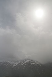 -前方に、雲の間から巨大な岩山が現れる