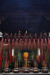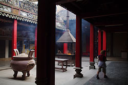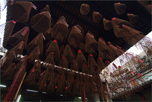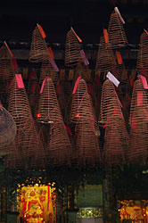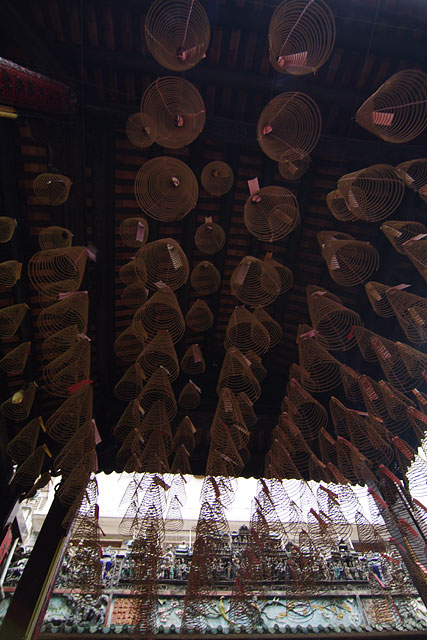- -おびただしい数の巻き線香が下がっている。